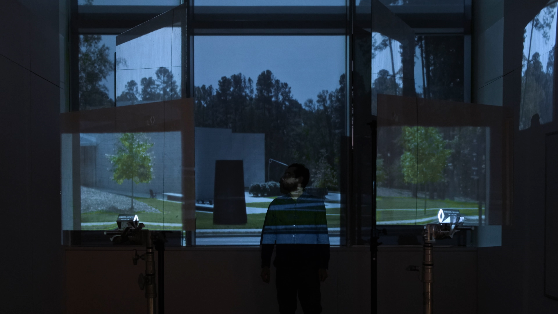 Polypropylene Mesh, One Way Mirror Film, Extruded Acrylic,Light Stands, 2K Video Projection, Central Subwoofer Audio